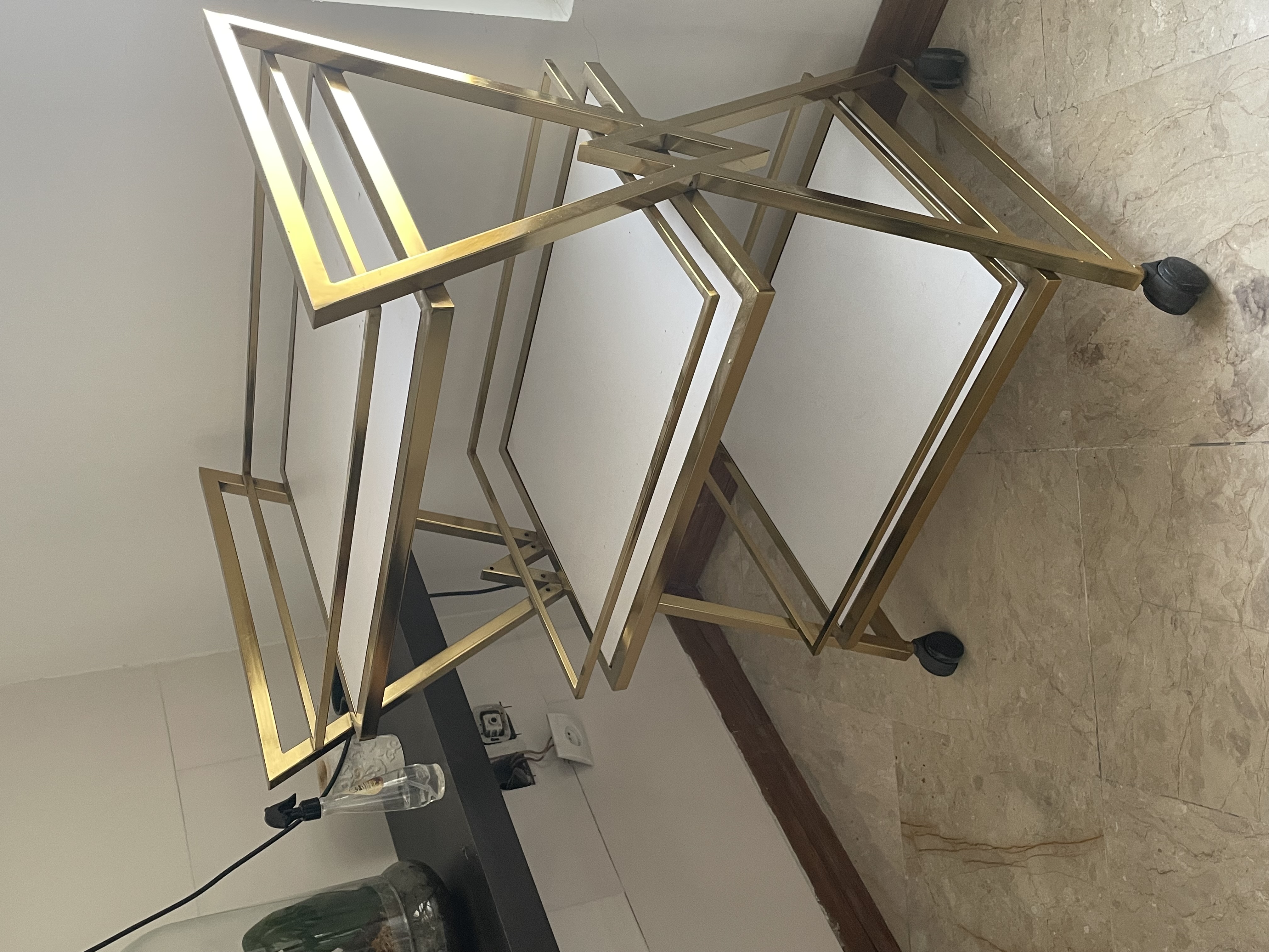 4 عددتخت مبلی عرض تختها 80 و سفارشی با چوب مرغوب 6 عدد صندلی تابوره نوک مدادی 2 عدد صندلی تابوره مشکی 4 عدد ترولی طلایی 1 عدد رخت اویز طلایی 1 عدد کانتر تابلو روان 1 عدد پدیکور با تمام تجهیزات اماده نصب 1 عدد پارتیشن شیشه ای قابل نصب در هر مکانی تمامی وسایل با کیفیت هستن و به دلیل تغییر دکوراسیون داخلی گذاشتیم برای فروش قیمتهارو بسیار پایین گذاشتیم