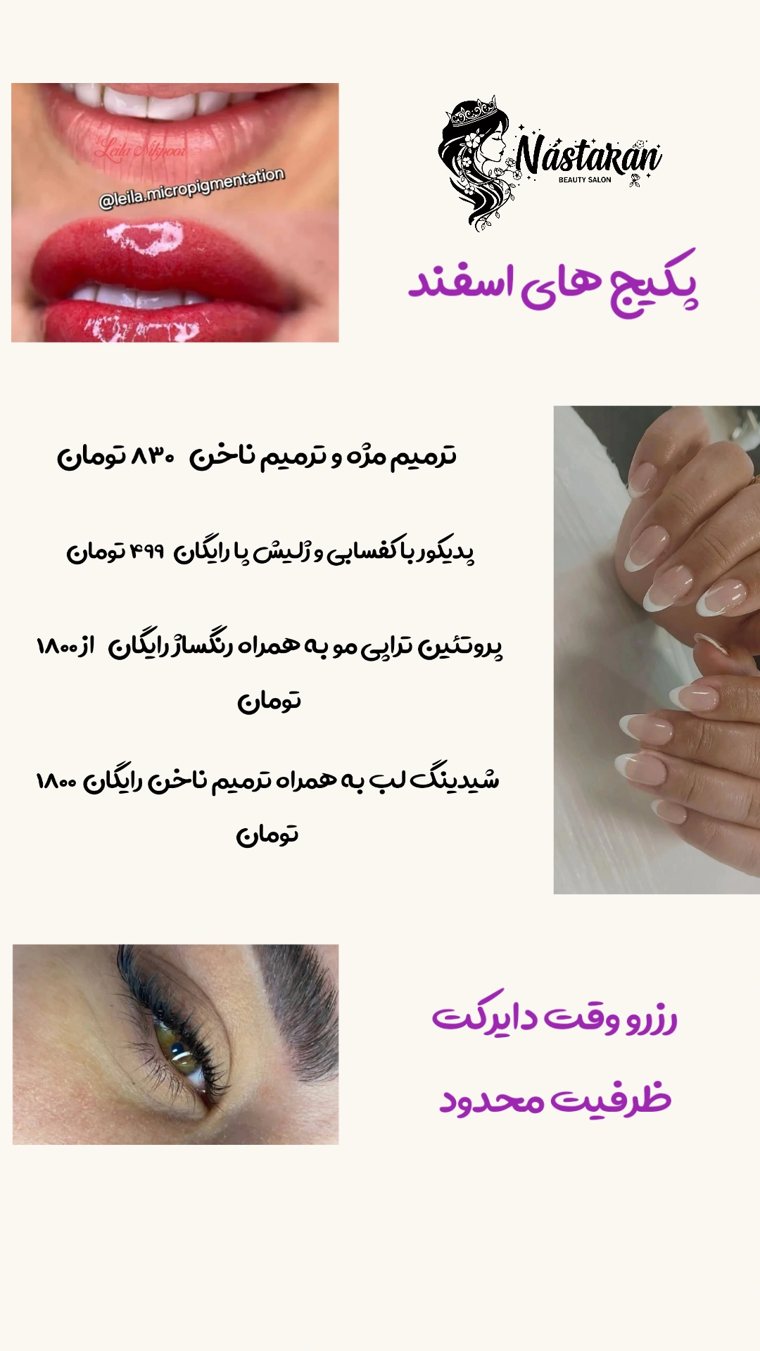 ارائه‌ی تمامی خدمات با بهترین مواد و کیفیت عالی درسالن زیبایی نسترن در منطقه ایت‌الله کاشانی با مجوز رسمی از اتحادیه ارایشگران ترمیم مژه و ترمیم ناخن 830 تومان پدیکور خیس با کفسابی و ژلیش پا رایگان 499 تومان پروتئین تراپی مو به همراه رنگساژ از 1800 تومان شیدینگ لب به همراه ترمیم ناخن رایگان 1800 تومان انواع بافت مو میکاپ با مژه و کانتور از 1200 تومان کوتاهی مو با براشینگ حرفه ای 500 تومان