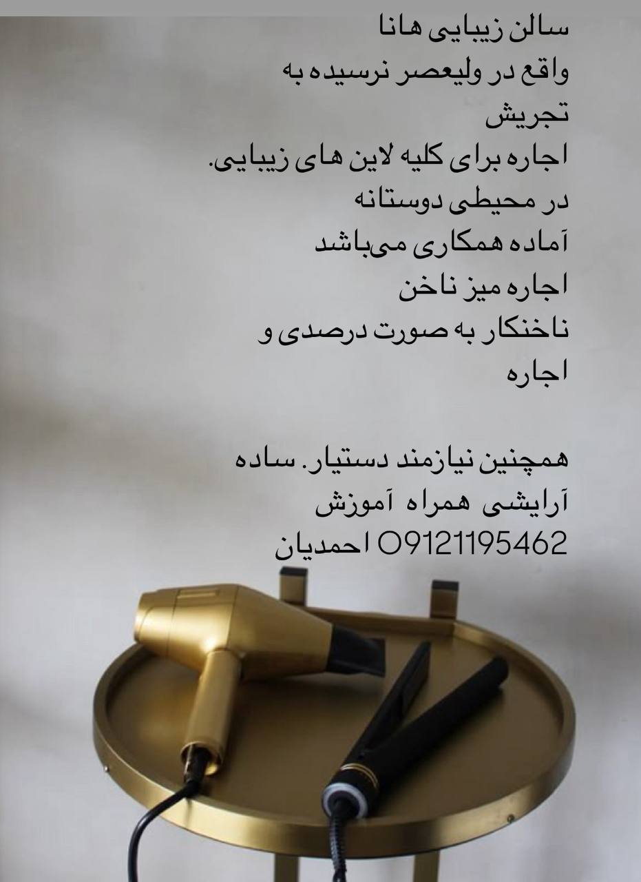واقع در ولیعصر نرسیده به تجریش اجاره برای کلیه لاین های زیبایی. در محیطی دوستانه اماده همکاری میباشد اجاره میز ناخن ناخنکار به صورت درصدی و اجاره همچنین نیازمند دستیار. ساده ارایشی همراه اموزش احمدیان