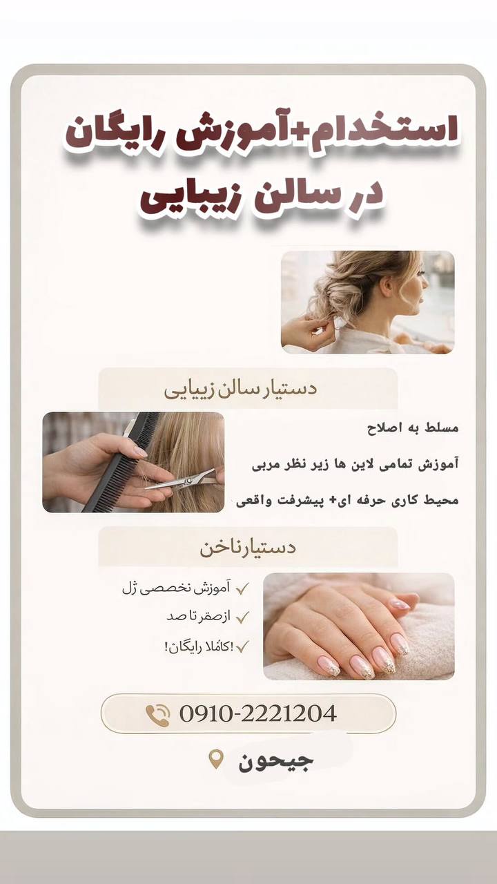 در سالن زیبایی ✨ دستیار سالن زیبایی ✔️ مسلط به اصلاح ✔️ اموزش تمامی لاینها زیر نظر مربی ✔️ محیط کاری حرفهای + پیشرفت واقعی ✨ دستیار ناخن ✔️ اموزش تخصصی ژل ✔️ از صفر تا صد ✔️ کاملا رایگان 📞 تماس بگیر: