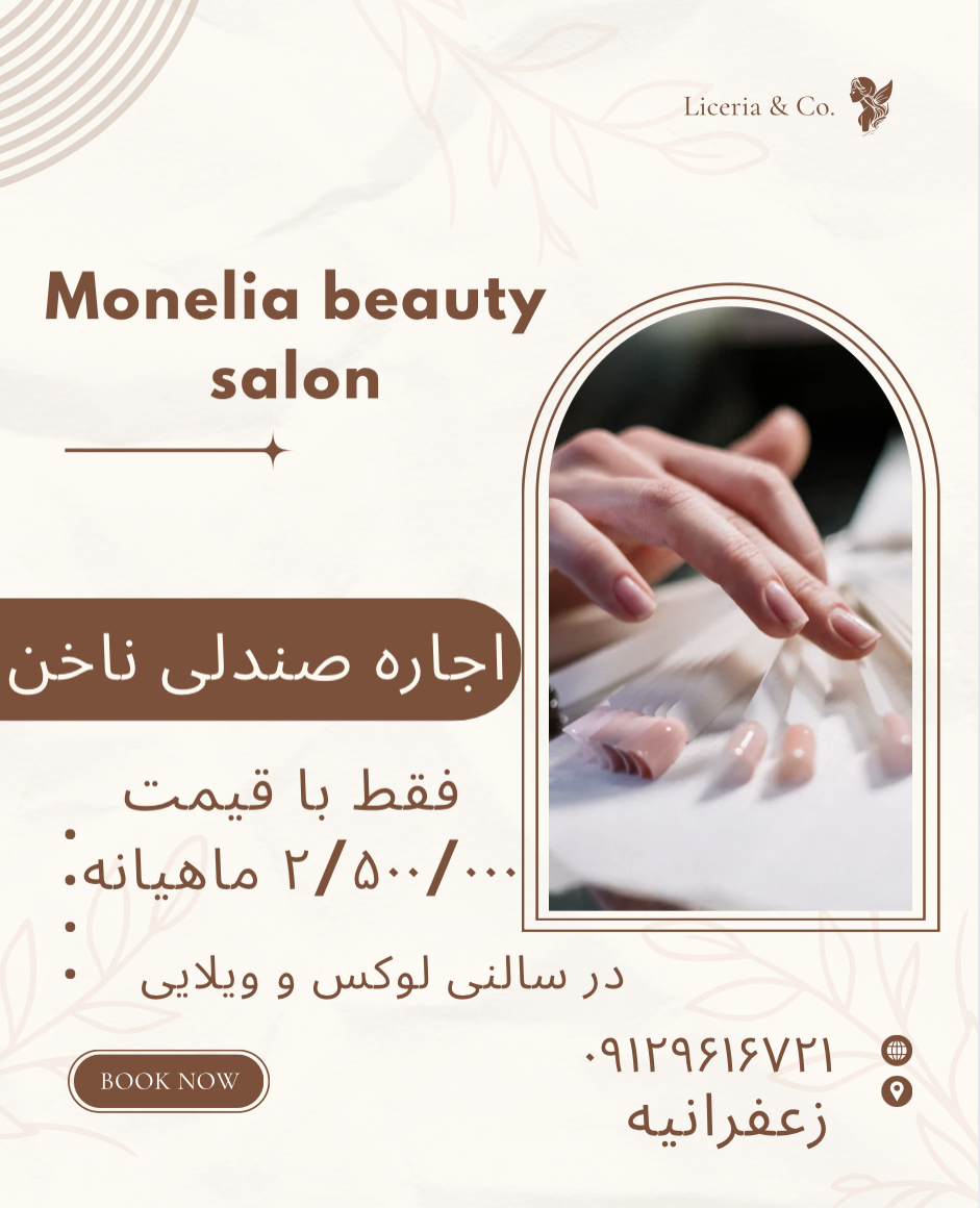 اجاره صندلی ناخن فقط با 2/500/000 تومان ماهیانه در سالنی لوکس و ویلایی از ناخنکاران عزیز در سالن مونلیا واقع در زعفرانیه دعوت به همکاری میشود راه های ارتباطی: واتساپ تماس تلفنی