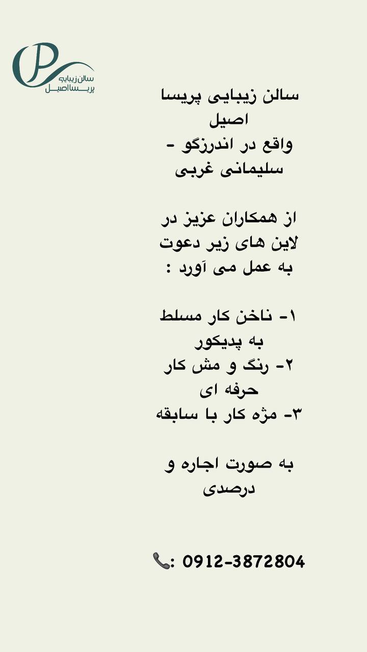 واقع در اندرزگو - سلیمانی غربی از همکاران عزیز در لاین های زیر دعوت به عمل می اورد : 1- ناخن کار مسلط به پدیکور 2- رنگ و مش کار حرفه ای - مژه کار با سابقه به صورت اجاره و درصدی سالن زیبایی پریسا اصیل