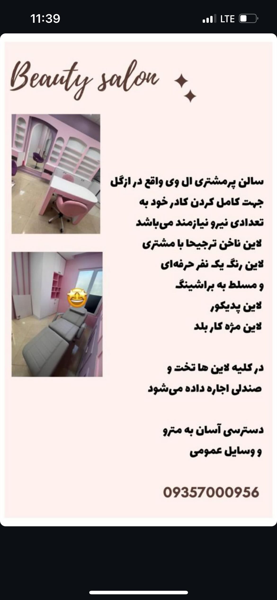 به یک خانم قابل اعتماد جهت پاسخگویی به مشتریان و رسیدگی به سالن نیازمندیم ساعت کاری 12 تا 8 25 تا 30 سال سن حقوق 5 تومان و یک ناخن کار و یک مژه کار صندلی و تخت اجاره داده می شود راه های ارتباطی: پیامک واتساپ تماس تلفنی