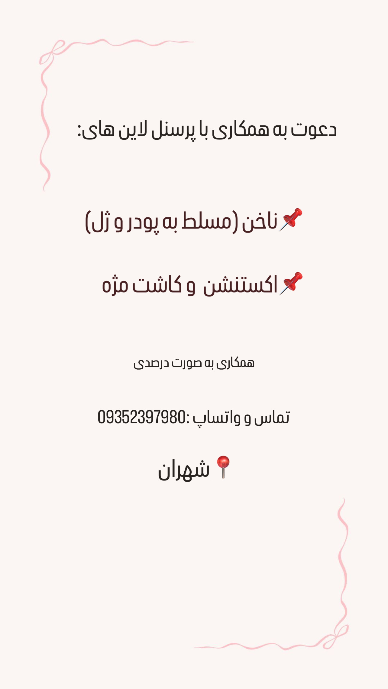 دعوت به همکاری با پرسنل لاین های: 📌ناخن: مسلط به انواع کاشت ژل و پودر 📌مژه: کاشت و اکستنشن محدوده شهران شمالی (بلوار اصلی) راه های ارتباطی: پیامک واتساپ تماس تلفنی تلگرام