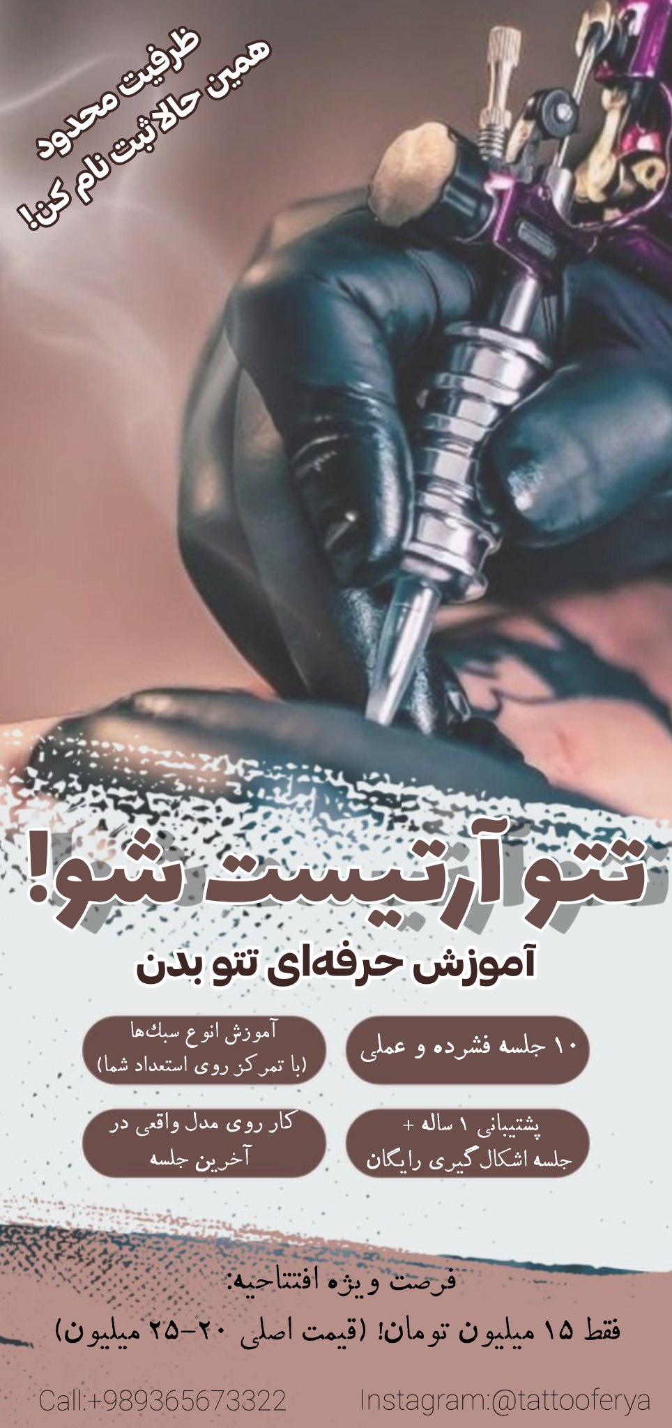 🔥 تتو ارتیست شو! 🔥 ✨ اموزش حرفه‌ای تتو بدن ✨ ✅ 10 جلسه فشرده و عملی ✅ اموزش انوع سبک‌ها (با تمرکز روی استعداد شما) ✅ پشتیبانی 1 ساله + جلسه اشکال‌گیری رایگان ✅ کار روی مدل واقعی در اخرین جلسه 💰 فرصت ویژه افتتاحیه: فقط 15 میلیون تومان! (قیمت اصلی 20-25 میلیون) ⏳ ظرفیت محدود! همین حالا ثبت‌نام کن! ⏳ اطلاعات تماس: +989365673322 ادرس : محدوده نیاوران راه های ارتباطی: تلگرام