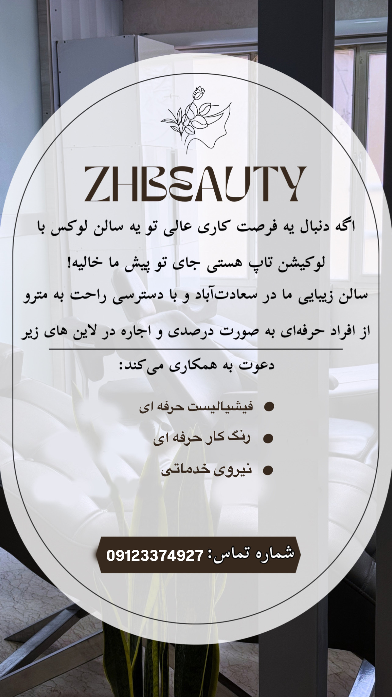 اگر دنبال یه فرصت عالی تو یه سالن لوکس و تاپ لوکیشن هستی جای تو پیش ما خالیه! سالن زیبایی ما در سعادت اباد و دسترسی اسان به مترو از افراد حرفه ای به صورت درصدی و اجاره در لاین های زیر دعوت به همکاری میکند: فیشیالیست حرفه ای رنگ کار حرفه ای نیروی خدماتی راه های ارتباطی: تماس تلفنی پیامک واتساپ تلگرام