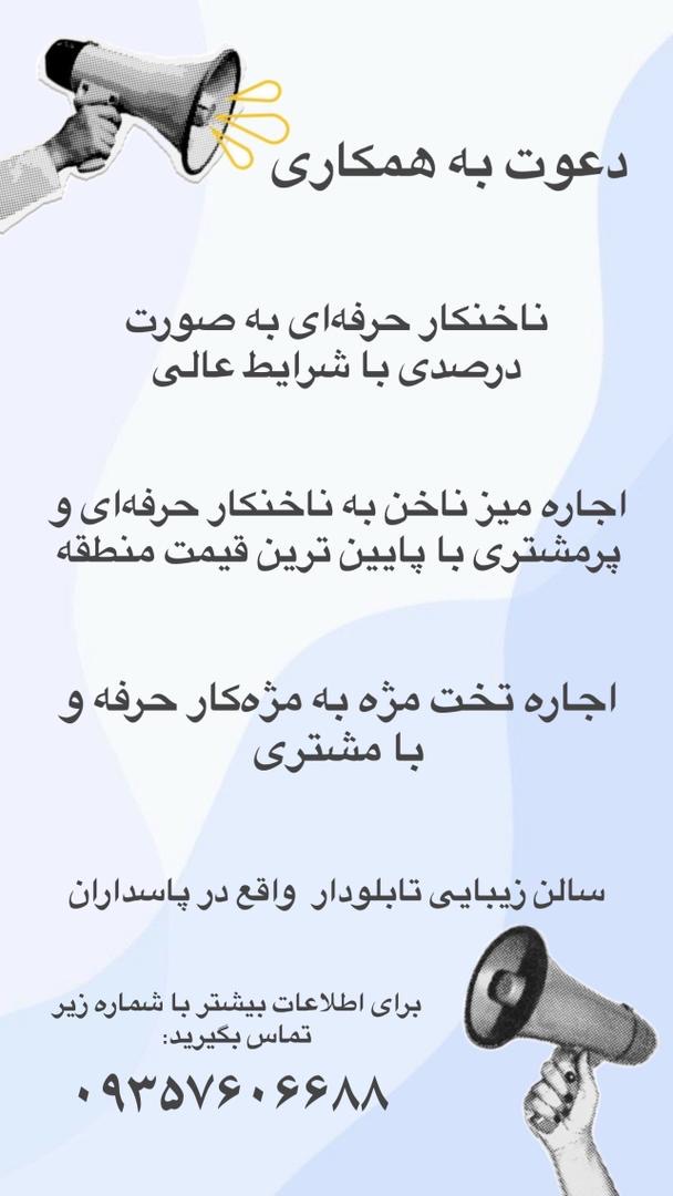 از بانوان با تجربه و حرفه ای در لاین مژه و ناخن به صورت درصدی و اجاره با شرایط خوب دعوت به همکاری مینماییم راه های ارتباطی: تماس تلفنی پیامک واتساپ