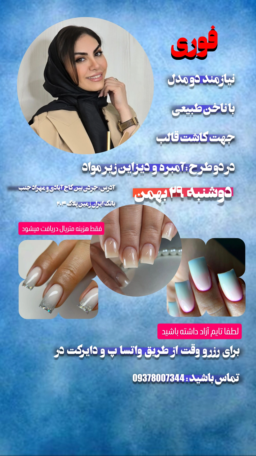 نیازمند دو مدل برای کاشت امبره با قالب و دیزاین زیر مواد – فوری 📅 دوشنبه 29 اسفند 🔹 ناخن طبیعی + دست خوشفرم برای عکاسی 🔹 فقط هزینه مواد دریافت میشود 🎁 هدیه ویژه: کفسابی داخل حوضچه برای یکی از عزیزانی که وقت اسفند را با ما فیکس کنند. پیام بدین برای هماهنگی! 09378007344 تماس در دایرکت /niloofun.nail.art