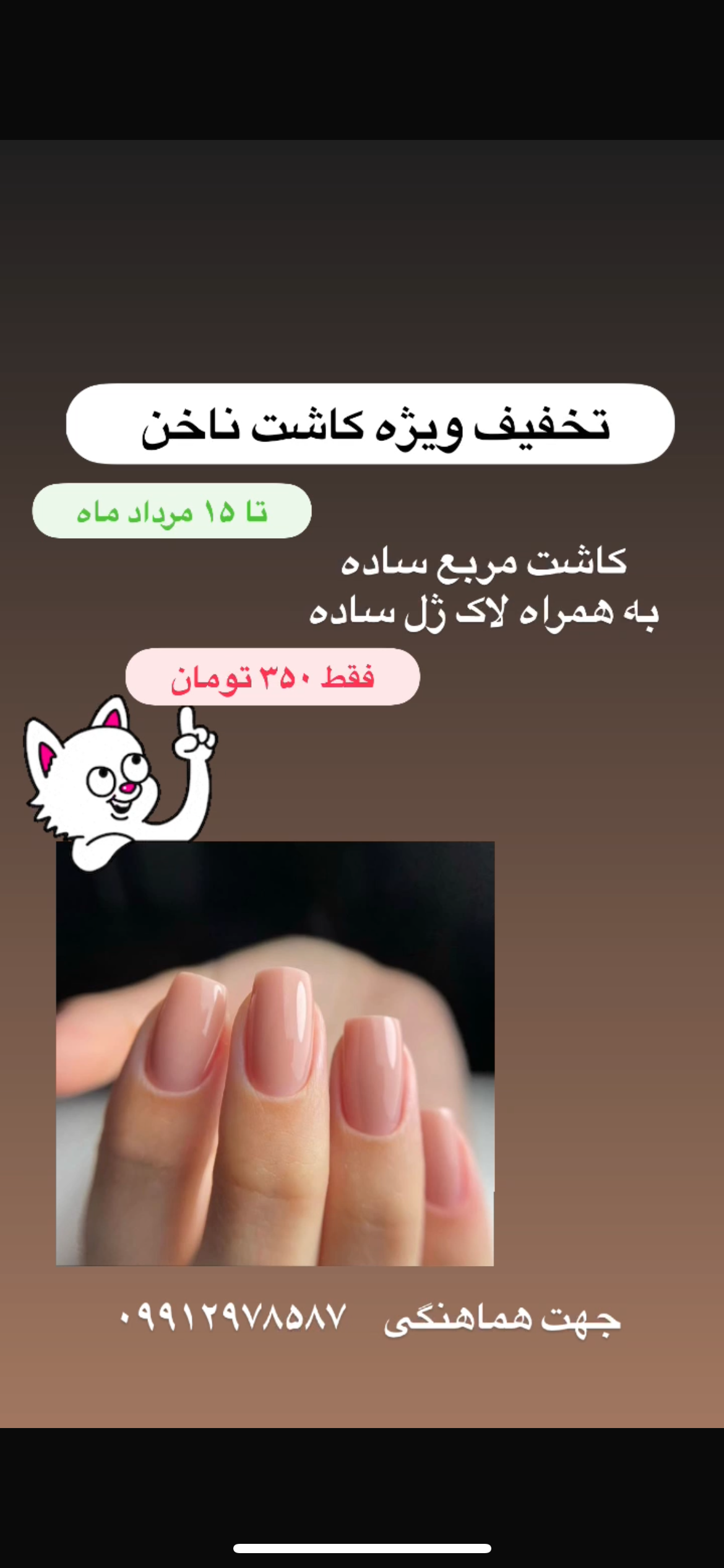 تخفیف ویژه کاشت ناخن تا 15 مرداد کاشت مربع ساده به همراه لاک ژل ساده فقط 350 تومان جهت هماهنگی به پیج زیر دایرکت بدین samin.nail13