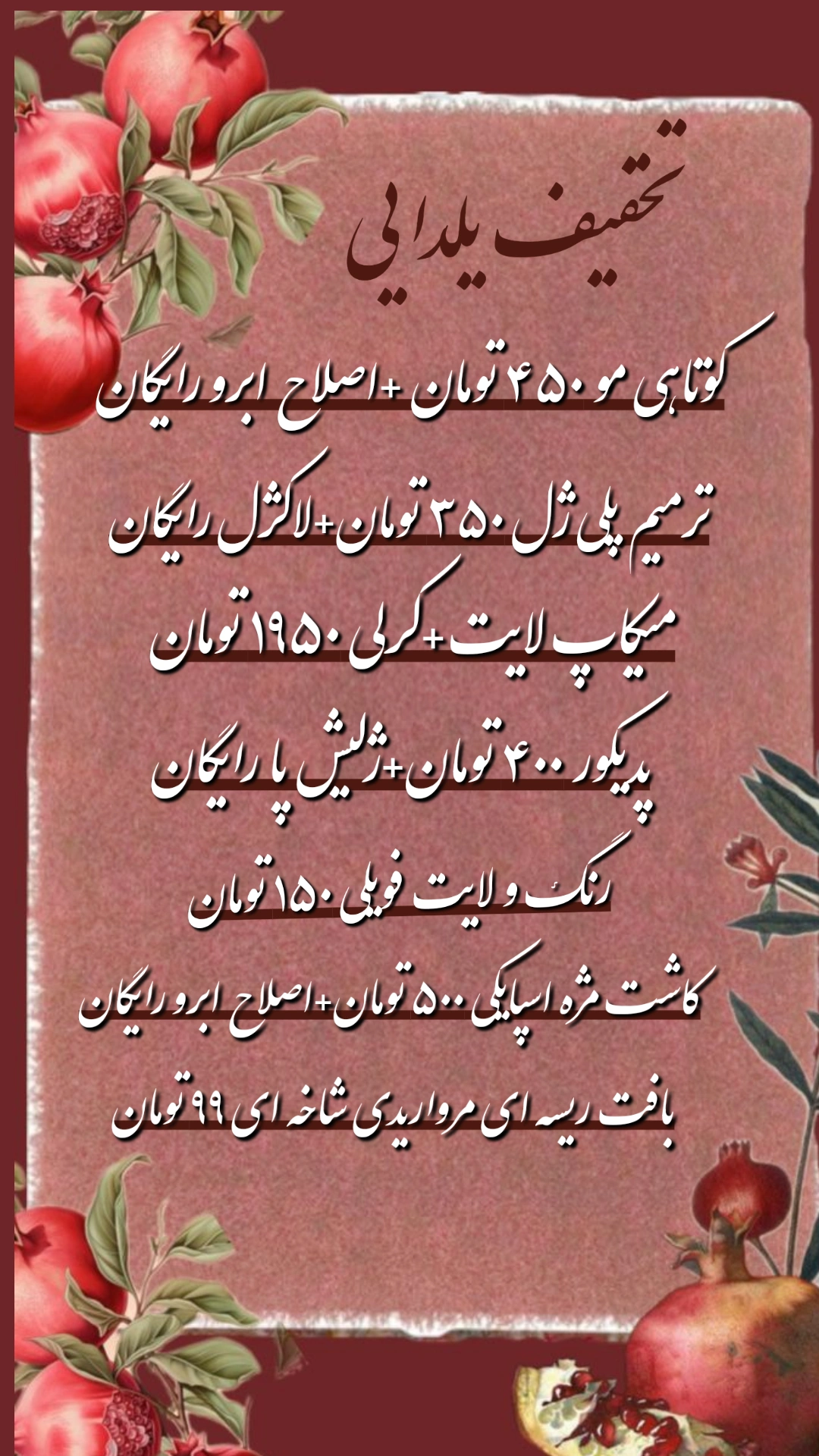 ارائه‌ی تمامی خدمات با بهترین مواد و کیفیت عالی درسالن زیبایی نسترن در منطقه ایت‌الله کاشانی ❌تخفیف ویژه به مناسبت یلدا❌ کوتاهی مو 450 تومان +اصلاح ابرو رایگان ترمیم پلی ژل 350 تومان +لاکژل رایگان میکاپ لایت +کرلی مو 1950 تومان پدیکور 400 تومان +ژلیش پا رایگان رنگ و لایت فویلی 150 تومان کاشت مژه اسپایکی 500 + اصلاح ابرو رایگان بافت ریسه ای مرواریدی شاخه ای 99 تومان محیط کاملا تمیز و مجهز برای رزرو وقت همین حالا پیام دهید