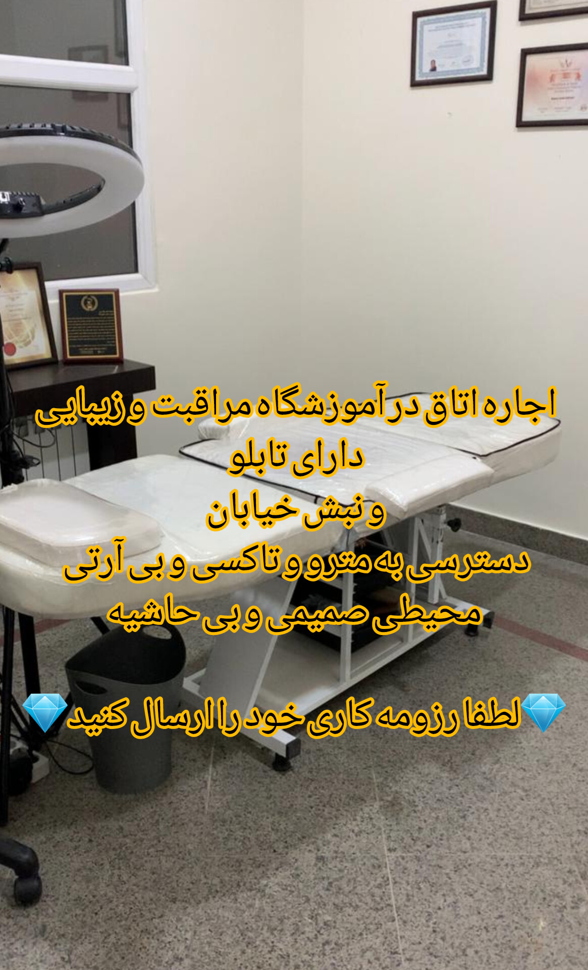 اجاره اتاق در اموزشگاه مراقبت و زیبایی دارای تابلو و نبش خیابان دسترسی به مترو و تاکسی و بی ارتی محیطی صمیمی و بی حاشیه 💎لطفا رزومه کاری خود را ارسال کنید💎