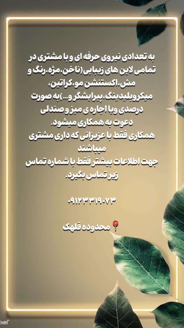 اگهیهای استخدام، اجاره، مدل، تخفیف و یا فروش لوازم در سالنهای قلهک