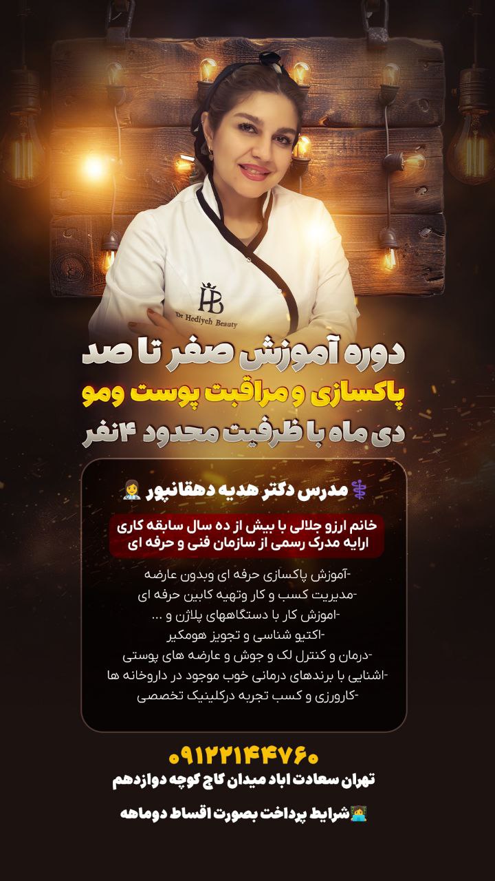 دوره اموزش صفر تا صد پاکسازی و مراقبت پوست ومو 👩⚕️مدرس دکتر هدیه دهقانپور خانم ارزو جلالی -اموزش پاکسازی حرفه ای وبدون عارضه -مدیریت کسب و کار وتهیه کابین حرفه ای -اموزش کار با دستگاههای پلاژن و ... -اکتیو شناسی و تجویز هومکیر -درمان و کنترل لک و جوش و عارضه های پوستی -اشنایی با برندهای درمانی خوب موجود در داروخانه ها تهران سعادت اباد میدان کاج کوچه دوازدهم