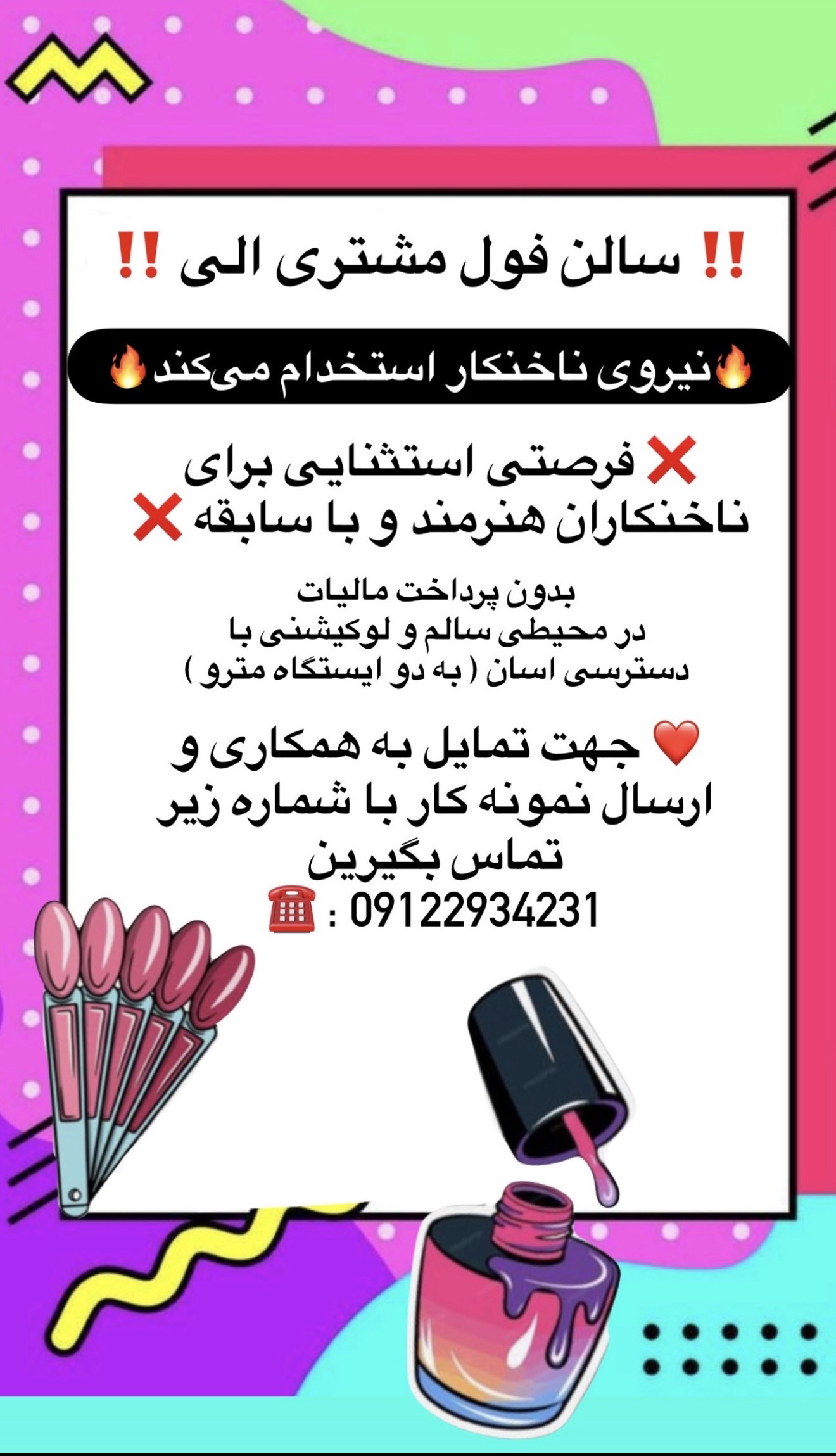 🔥 فوری ‼️ ❌سالن فول مشتری✨ الی واقع در خیابان دولت تهران از ناخنکاران با سابقه و مسلط دعوت به همکاری مینماید ❤️ ✅ دارای محیطی امن و دسترسی اسان به دو ایستگاه مترو ( نوبنیاد و قلهک) ✅ تسویه به موقع ✅ مالیات گرفته نمی‌شود ✅ همچنین میز برای اجاره هم موجود هست ❤️ جهت تمایل به همکاری و ارسال نمونه کار شماره زیر را ذخیره کنین و تلفنی تماس بگیرین و یا در واتساپ مجموعه پیام بگذارید 👇🏼 ☎️ : 09122934231 راه های ارتباطی: پیامک تلگرام واتساپ تماس تلفنی