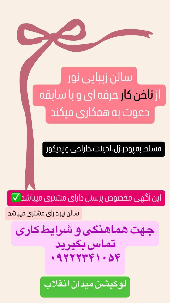از ناخن کار حرفه ای ترجیحا با مشتری با سابقه ی حداقل 3سال بصورت درصدی و پاره وقت دعوت به همکاری میشود حتما نمونه کار و پیج کاری رو ارسال کنید شرایط درصدی ✅ سالن مشتری داره✅ ساعت کاری 10 تا 7✅ 📍میدان انقلاب کارگر جنوبی