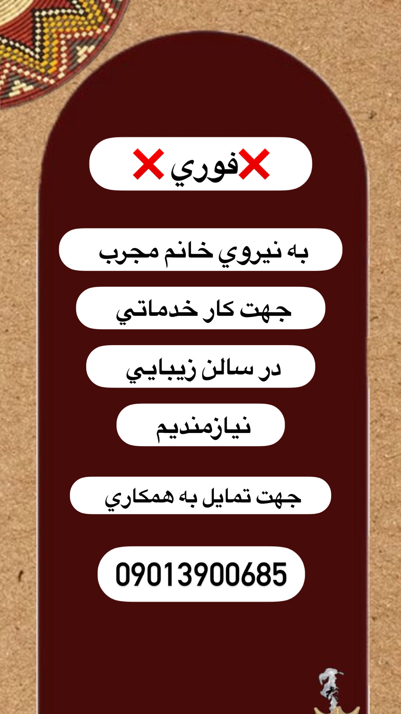 ❌‼️فوری ‼️❌ استخدام نیروی خانم مجرب جهت کار خدماتی در سالن زیبایی الی واقع در پاسداران تهران جهت تمایل به همکاری با شماره 09013900685 تماس بگیرین راه های ارتباطی: پیامک واتساپ تماس تلفنی تلگرام