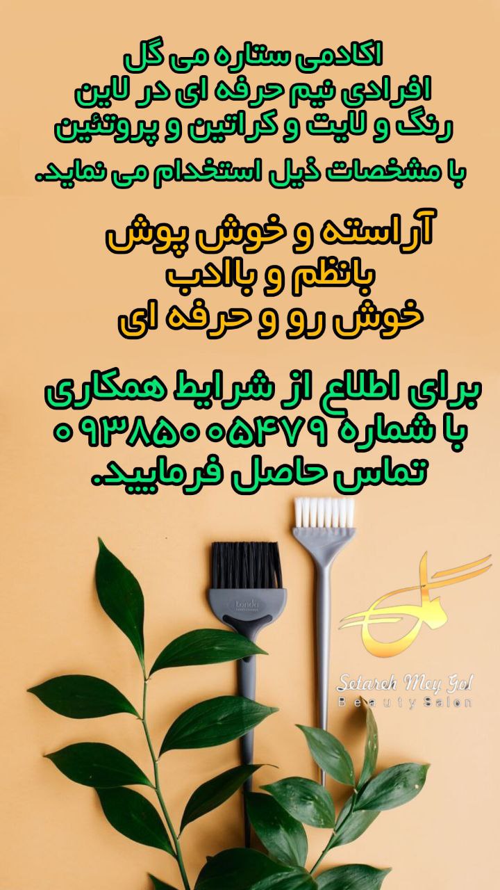 متن ا⚜️کادمی ستاره می گل⚜️ افراد نیمه حرفه ای در لاین رنگ و لایت و کراتین و پروتئین با مشخصات ذیل استخدام می نماید.. ✅️اراسته و خوش پوش ✅️بانظم و ادب ✅️خوش رو و حرفه ای ❌️برای اطلاع از شرایط همکاری با شماره زیر تماس حاصل فرمایید .❌️