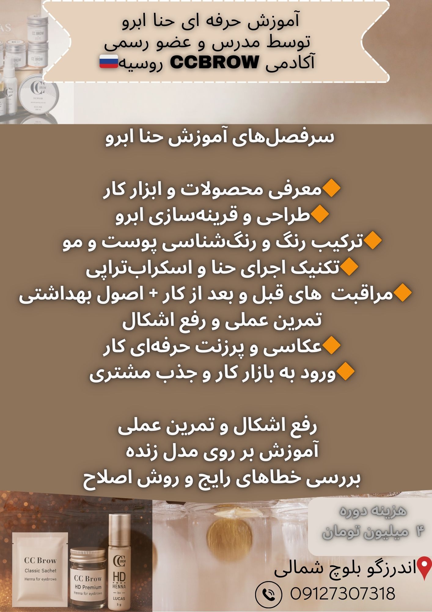 🇷🇺✨ اموزش حرفهای حنا ابرو با مدرس رسمی اکادمی CCBrow روسیه ✨🇷🇺 🔹 با یادگیری این لاین جدید و ثروت ساز💵💸خیلی زود وارد دنیای زیبایی میشی و میتونی به صورت تخصصی کار کنی. 🔸 این دوره شامل مقدمه و اشنایی با ابزارها و محصولات مبانی طراحی و اناتومی ابرو اموزش کار با حنا ابرو شناخت رنگشناسی و تناسب با چهر بهداشت و اصول ایمنی رفع اشکال و تمرین عملی عکاسی و پرزنت حرفهای کار ورود به بازار کار و برندسازی شخصی و…. 🔹 بعد از ثبتنام، به کانال اختصاصی تلگرامی اضافه میشی که داخلش از 0 تا 1000 تمام رفع اشکالها، نکات کلیدی و اپدیتهای روز دنیا گذاشته میشه. 🎁 هدیه ویژه دوره: اموزش اسکرابتراپی ابرو برای نتیجهای ماندگارتر و حرفهایتر. 💎 با شرکت در این دوره، هم یک مهارت هنری و درامدزا یاد میگیری و هم مسیر ورود به شغل زیبایی رو حرفهای و مطمئن شروع میکنی.چون من تا اخرش کنارتم😍 لوکیشن: اندرزگو بلوچشمالی جهت ثبت نام و مشاوره با شماره زیر در ارتباط باشید 09127307318 اینستا Fahimeh.rashidi.salon N.browlift راه های ارتباطی: پیامک تلگرام تماس تلفنی واتساپ