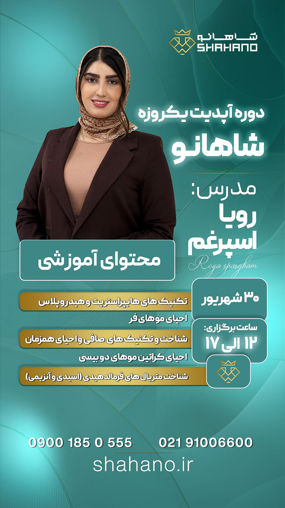 دوره یکروزه اپدیت با شاهانو اولین کمپانی وارد کننده محصولات کراتین، پروتئین و احیا و اسکالپ سر تو لایق بهترین هایی و ما همیشه همراهتیم برای اولین بار تنها با پرداخت 250 هزار تومان اپدیت شو بهترین ها با شاهانو همراهند و برای اشنایی بیشتر با کمپانی شاهانو دعوتتون میکنم برای 30 شهریور یک دوره یکروزه اپدیت با شرایط خاص و ویژه خوشحال میشیم در کنارمون باشین راه های ارتباطی: تماس تلفنی واتساپ پیامک